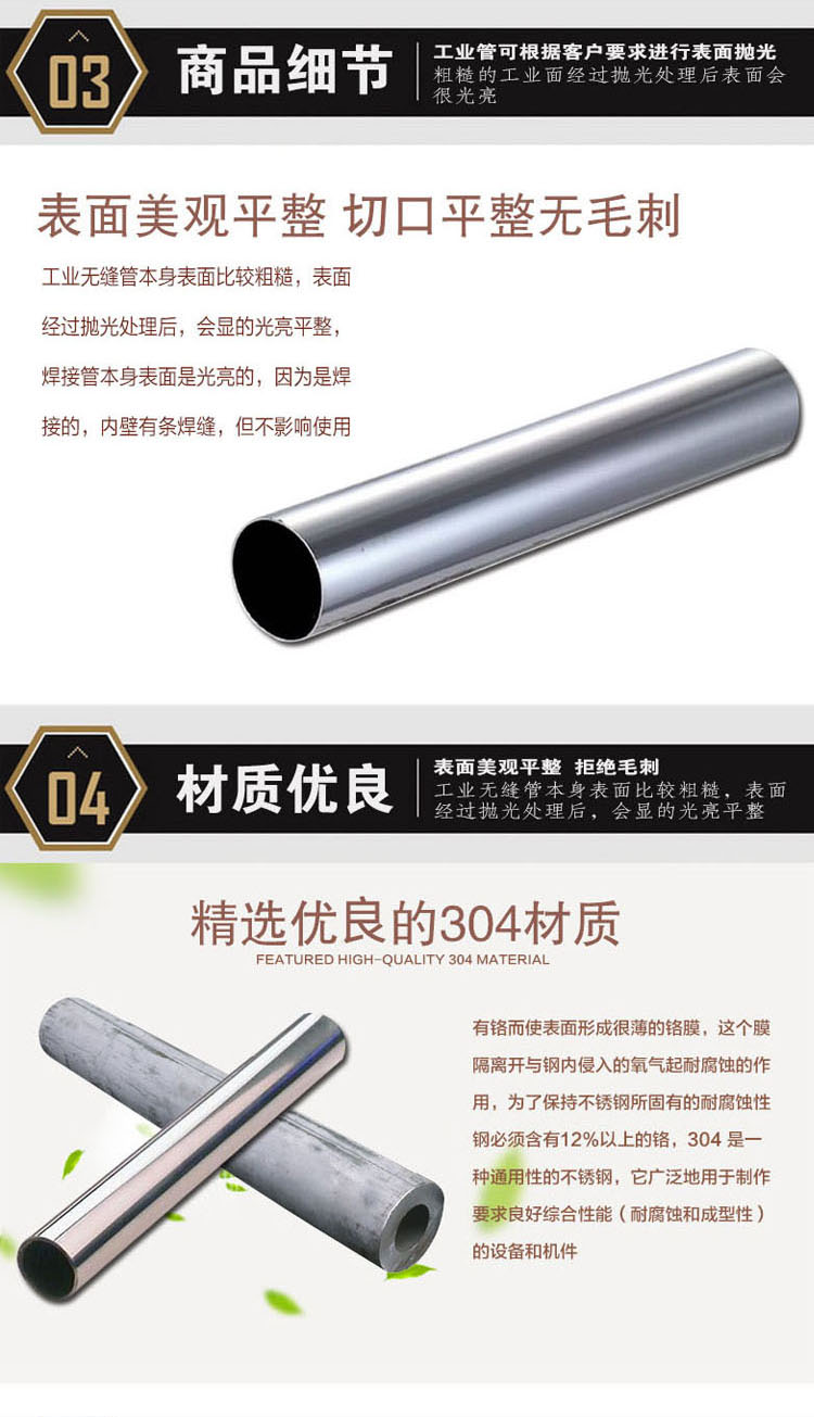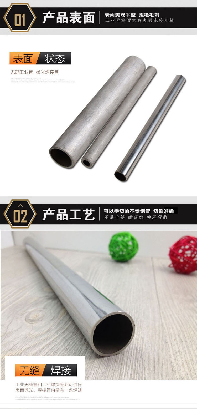 產品規格:12.7*12.7mm-400*400mm,壁厚0.6mm-20mm,不銹鋼圓管一般為6*1-630*28,規格有4分、6分、1寸、1.2寸、1.5寸、2寸、2.5寸、3寸、4寸、5寸、6寸、8寸、102、108、127、133、139、159、168、177、194、219、273、325、377、426、530、630等。不銹鋼異型管一般多是指方矩型鋼管、三角鋼管、六角鋼管、不銹鋼花紋管、U型管、D型管、水彎等。